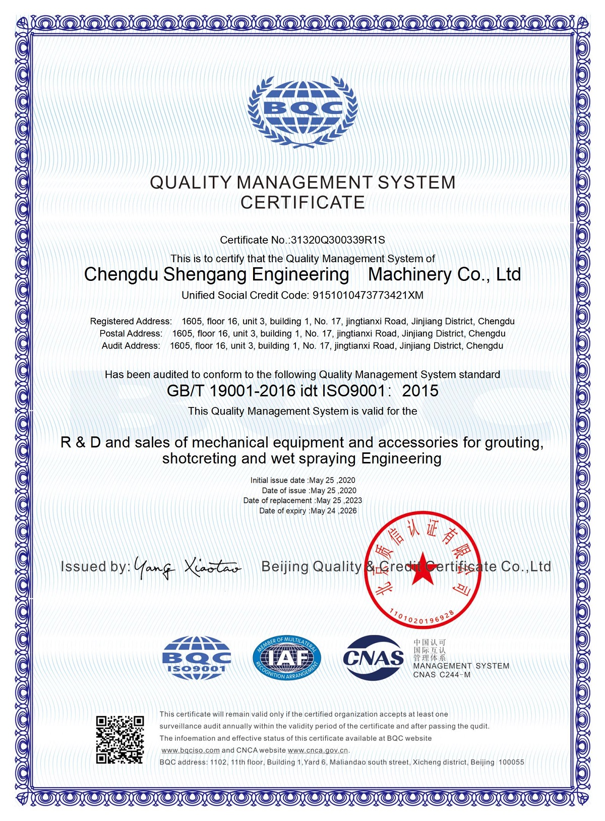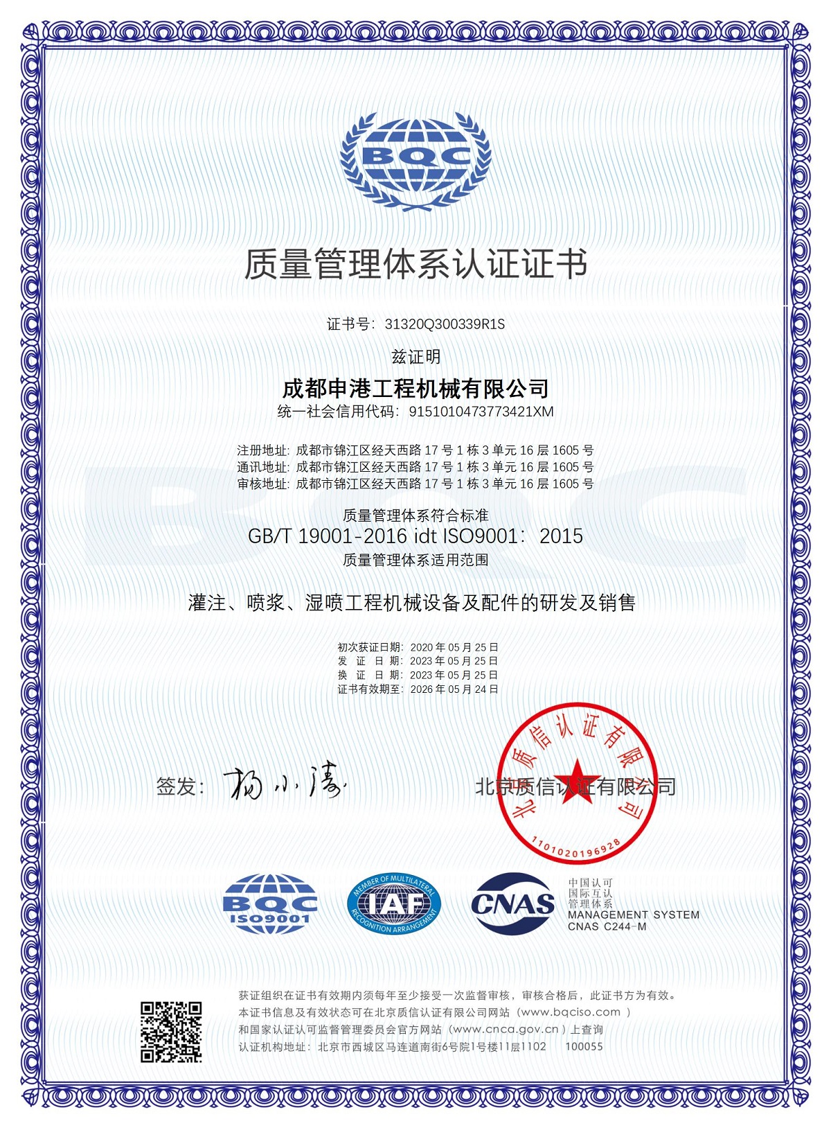 525日,成都申港工程機(jī)械有限公司完成《質(zhì)量管理體系認(rèn)證證書》換證工作,標(biāo)志著成都申港公司質(zhì)量管理體系工作再次得到中國(guó)質(zhì)量認(rèn)證中心關(guān)于ISO9001質(zhì)量管理體系的認(rèn)證和審核。